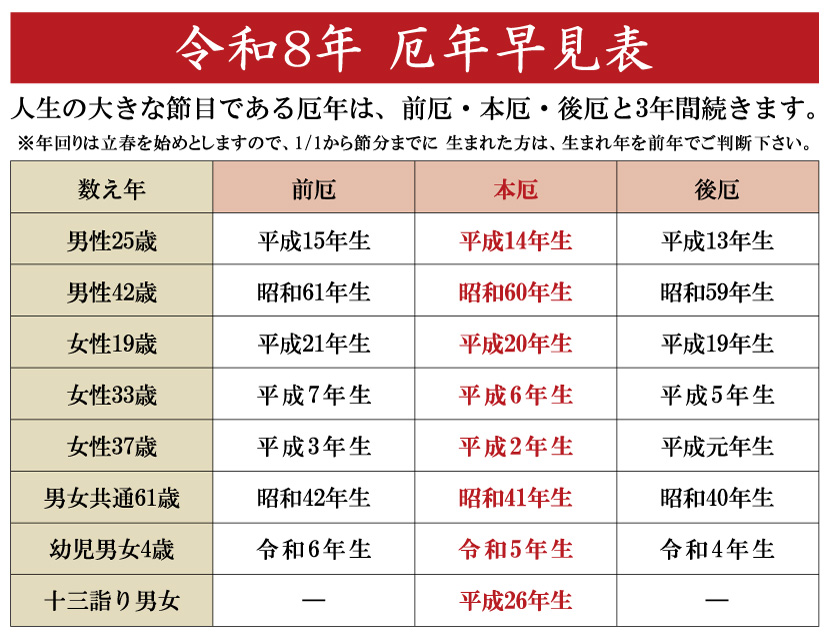 人生の大きな節目である厄年は、前厄・本厄・後厄と3年間続きます。右の表をご覧になり、厄年の方は毎年新たに御祈祷を受けて、日々の健康と安泰をお祈り致しましょう。また、男女とも、数え年13歳は、十三詣りという厄にあたります。
